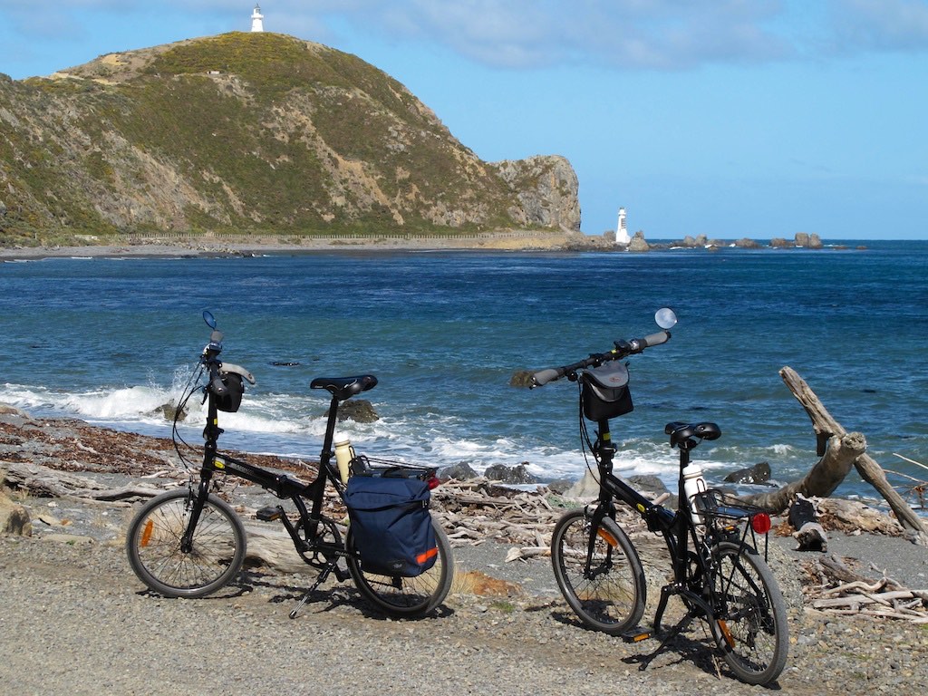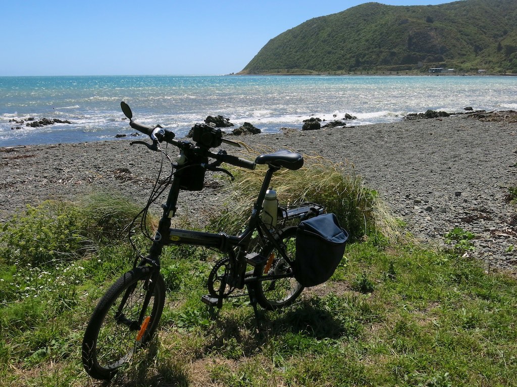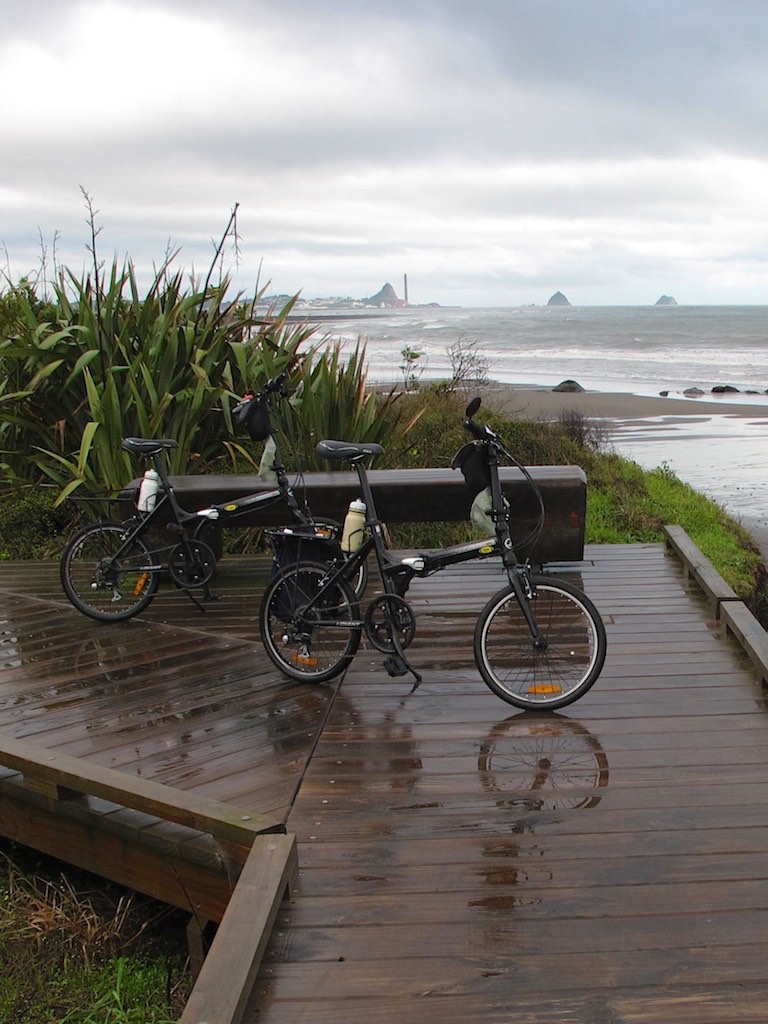 ConclusionThe bikes are performing well. As I have gained fitness the urge to upgrade the gearing has dissipated. Much of the recreational cycling, in the first half of last century, including round the World trips, was done by people using 1 or 3 speed gearing. The 3 speed bikes also had less than half the gearing range I have now. In most applications there is little need to substitute higher grade bike components. However, I have recently improved the gearing, mainly to help with my steep Wellington riding. I have found that off-road loose surface riding is a good way to gain bike handling skills. When I was at school, much of my long distance riding was on gravel roads using a standard racing bike with narrow tyres. I also took my children on some slow rides around a local BMX track, when they were learning to ride normal bikes. With suitable bike skills a suspension is not required for recreational off road riding. Partially lifting off the saddle when negotiating bumps removes a lot of stress from the bike and the body. The bike simply rocks back and forth. This is just like a Mars Rover, which operates without any suspension. Similar skills are required for BMX bikes and comfortable horse riding. Wellington has many cycle trails with easy access from the central City. For example, the Pencarrow Head ride can start with a ferry trip to Days Bay. The Hutt River Trail can start with a train or Ferry trip to Petone or a down-valley trip can start from Upper Hutt. A Kennett Brothers book, "Wellington's Best Bike Rides", is recommended. When cycling in New Plymouth we discovered that the bikes are good in the rain. The carrier, added at the rear, provides some spray protection from the rear wheel. The small wheel size at the front means the feet don't get as wet as they do on a standard bike. See Dizzy's folding bike blog and the photo at right. The folding bike has provided me with a pleasant way to improve my health. In addition, I have been able to explore many areas in my own city that are new to me. The gains have been significant. I am usually pain free, which was not the case before I started this activity. After more than 3500 km we have had few problems with these bikes. They are entirely suitable for our current activities.