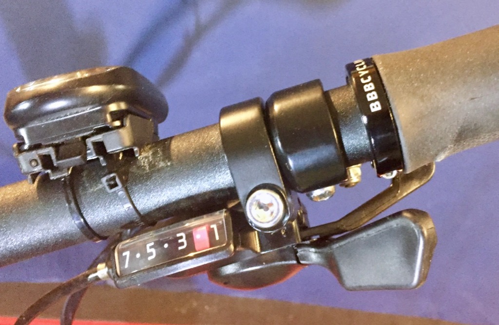 The height is only a problem when the bike-stand is deployed. This 60 mm discrepancy is in the least important dimension from a commuting point of view. Clearly there is a magic angle where all dimensions will easily fit. In other words, this bike would easily fit inside a box of the required dimensions. For air travel Air New Zealand has a dimension W + L + H which can't exceed 1580 mm. With the seat and wheels removed this sum for the Expressway 2 is 660L + 520H + 380W = 1560 mm. Diagonal packing in the bag should reduce this figure slightly. Including wheels and saddle the Expressway 2 size is 830L + 650H + 380W = 1860 mm. The wheels and seat would need to be stowed separately, maybe in another bag. Blocks or an adapted quick-release, inserted in place of each wheel, would strengthen the frame. Clothing and other items in plastic bags can fill the remaining space. For comparison a Brompton, including wheels and seat, is 585L + 565H + 270W = 1420 mm. A Bike Friday soft travel bag is 830L + 708H + 219W = 1757 mm, to contain a disassembled custom sized bike. A Tern BYB P8, including wheels and saddle, is 810L + 520H + 350W = 1680 mm. A Tern Link D8 is 790L +720H + 380W = 1890 mm. AdditionsCarrierI was told that I could not fit a standard carrier on this bike. In fact it was easy to fit, so both bikes now have carriers. They are set back far enough to take my old pannier bags, if needed. I added some studs to a second-hand plastic tool box so it can be held on top of the carrier with a bungee cord. It contains maintenance items for longer trips. I have mounted a small pump under the carrier. MirrorA CatEye bar-end mirror was fitted to each bike. This addition is probably the most important as it contributes to safety. You can see the line that traffic is taking behind you, whether any indicators are flashing, and the approach of other cyclists. I have used a bar-end mirror on my mountain bike since the late 1980s. When riding on busy roads it helped me assess the space that wide vehicles, such as trucks, would leave me. I filed some plastic off the inside of the end-cap so the mirror tilted out further. This prevented it being knocked by my hand, during rides. Rear Bottle HolderOn each bike I was able to fit a 600 ml drink bottle holder behind the seat attached to the carrier and its support-stay. The bottle holder tabs were bent slightly to fit and a single 5 mm hole was drilled in the carrier. The triangle thus formed made the carrier-stay more rigid as well. I did not like supporting the bottle horizontally on the frame, in front of the rider as it interferes with stepping over the frame to ride or to dismount. Bike ComputerI purchased two Cateye Velo 5 bike computers so we can each keep track of the distance travelled. This basic model has trip distance, odometer, maximum speed and a clock. The Velo 8 offers more options, including average speed. BagsI had some old Lowepro camera bags which were easily mounted on the front handlebars. They can contain items such as locks, sun-glasses, cameras and tyre repair kits. These bags have pull-out rain covers. SaddlesI replaced the saddles with ones which had longer mounting rails and improved comfort. This allowed us to set the saddles back further so that the set-up was similar to my mountain bike. We also purchased a gel seat cover, in case one of us has comfort problems on a long ride. LightingI have a basic LED lighting set-up for emergencies. I don't anticipate cycling at night. An Interesting UpgradeHaditta, a cyclist from Tehran has upgraded an ExpressWay 2 folding bike to help with his cycling on hills. The current model of the ExpressWay 2 has a 7 speed MFTZ21 14-28T free-wheel hub. The free-wheel mechanism is built into the 7 speed cassette. In order to accommodate cassettes with 8 to 10 speeds, the rear hub (or wheel) needs to be changed to a free-hub version. The free-wheel mechanism is now in the hub. All the wider range cassettes require an Altus derailleur to be fitted because there is more chain slack to deal with. The Altus derailleur has two relatively large diameter jockey wheels where much of the additional chain slack is taken up. This allows the length of the derailleur arm to be shorter, which fits with a 20 inch wheel. The 7 speed Shimano Mega-Range 14-34T free-wheel cassette does not require a new hub, but a Shimano Altus derailleur is advised to take up the additional chain slack. For a gearing range greater than 7 speeds a new shifter will also be needed. Haditta fitted a 9 speed Shimano Deore HG50 cassette, a Shimano 9 speed rear hub, and a Shimano Altus derailleur. He changed the shifter to a Shimano Deore 9 speed version and a narrower Shimano Deore 9 speed chain was used. A fixed Shimano front derailleur was also fitted to help control the chain. Haditta upgraded the front hub to a Shimano Deore version, this being part of his upgrade kit. Both wheels now have quick release mechanisms fitted. Apart from some initial issues with chain skipping on the smallest sprocket, the conversion was a success. The saddle was upgraded to a DDK K-30 model. The plastic folding pedals were removed and metal Polifly pedals substituted. These do not fold, as the original pedals were rarely folded anyway. Haditta added Velo grips with included bar-ends. These provide alternative hand positions when he rides longer distances. Holders were added for a cable lock, a pump and a water bottle. Front and rear lights, manufactured by Giant, were fitted. Hadittta has now modified the handlebar setup by adding a zoom stem and a riser style handlebar. He removed the top clamp from the steerer tube which was then capped. The bar-end grips were refitted. The slightly extended reach improved the handling of the bike without interfering with the folding. Note that on an unmodified bike the steerer tube is angled forward and functions like a short stem. Haditta kindly provided the following photo, which shows most of the modifications.